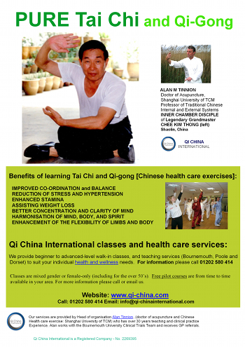 Qi China International also provides medical condition specfic classes. Our therapeutic healthcare exercise sessions provide for sufferers from such conditions as arthritis, cardiovascular, respiratory / pulmonary conditions, stress relief and wellbeing. For information about class locations, times and enrolment, telephone: 01202 580 414. More information about our classes and services is provided on our pdf information sheet (left): please forward to any party or person that you feel may benefit. Note: We can provide short pilot courses that offer free membership and tuition / no-class fees, that may be available in your area. To register your interest and learn more please call the number above.